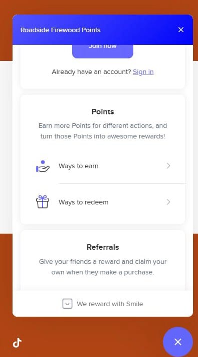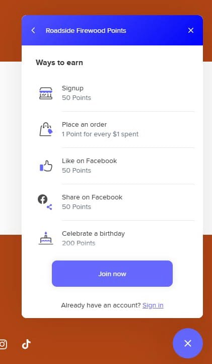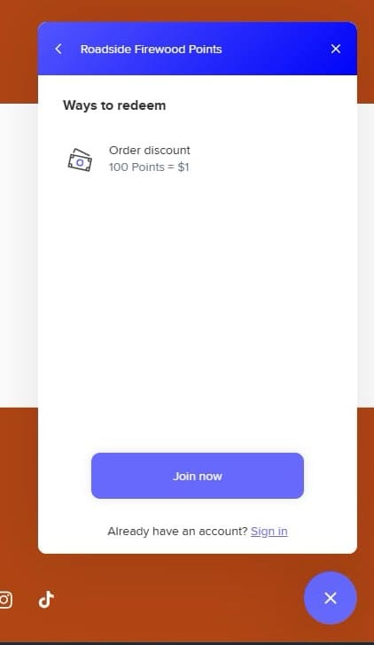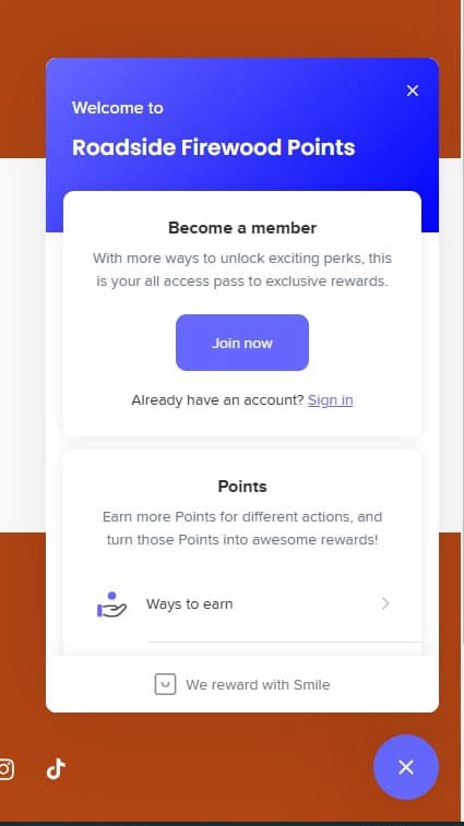 Welcome to Roadside Firewood Points! Sign up today to unlock exciting perks, earn points for every action, and turn them into exclusive rewards. Tap 'Join Now' to get started or 'Sign In' if you're already a member.