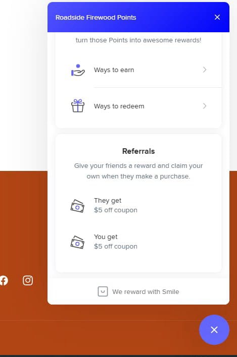 Explore Roadside Firewood Points and start earning rewards today! Learn the 'Ways to Earn' points and discover the 'Ways to Redeem' them for exclusive discounts and perks. Don’t forget to refer your friends to earn even more rewards for both of you. Join now and start saving!
